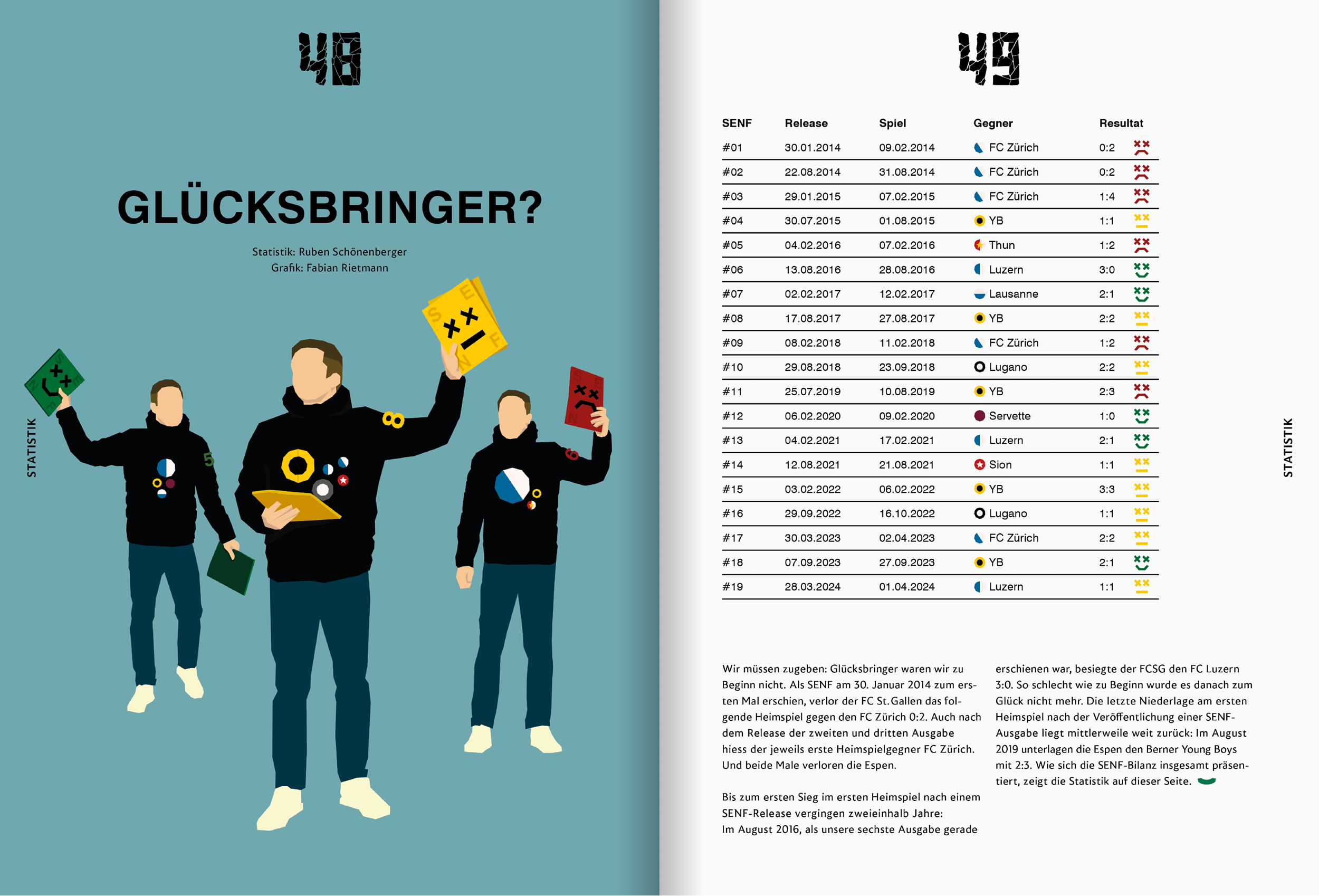 Die Jubiläumsausgabe ist auch unser Abpfiff. Von 2013 bis 2025 publizierten wir halbjährlich SENF – Das St.Galler Fussballmagazin. Nach rund zweieinhalb Millionen geschriebenen Zeichen auf rund 1'750 Seiten und über 15'000 verkauften Exemplaren ist Schluss: Wir pfeifen ab. Und pfeifen gleich wieder an.